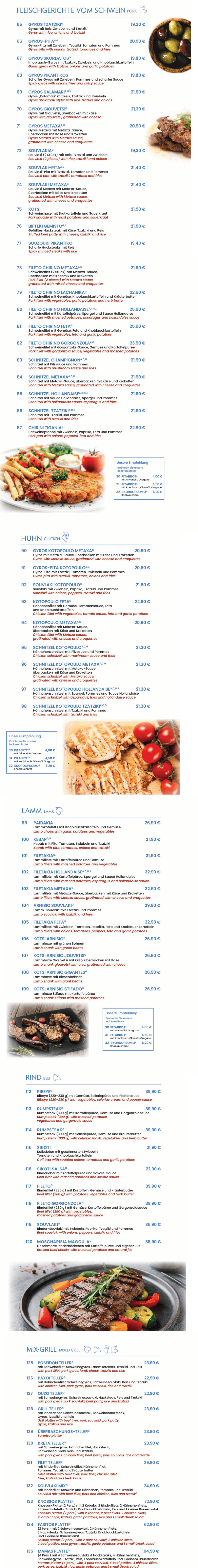 Entdecken Sie unsere Auswahl an traditionellen griechischen Fleischgerichten. Von Gyros und Souvlaki bis zu gegrilltem Fleisch und mediterranen Spezialitäten vom Grill. Serviert mit frischen Beilagen und hausgemachten Saucen – perfekt für ein authentisches griechisches Essen in Berlin.